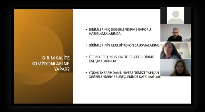 Kalite Koordinatörlüğü tarafından, kalite komisyon başkanlarının ve koordinatörlük çalışanlarının katılımı ile gerçekleşen toplantı geniş katılım ile gerçekleşti. Tüm birimlere resmi yazı ile duyurulan bilgilendirme toplantısında, Kurum İç Değerlendirme Raporu Hazırlama Sürecinden, kanıtların neler olabileceğine ve Kalite Koordinatörlüğünün yapmayı planladığı çalışmalardan bahsedildi.